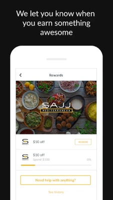 Collect points to redeem rewards, with rewards starting at only 150 points! Choose from a variety of rewards like $20 off, free catering, and free SAJJ swag.